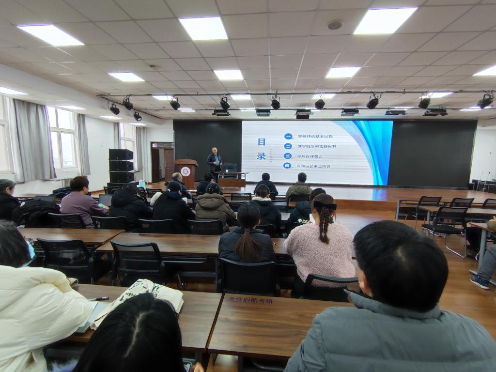 刘宏月首先介绍了审核评估的基本过程,详细解读了制定评估方案、动员和培训、梳理教学档案、整理支撑材料以及撰写自评报告等工作。他指出,教学档案和支撑材料是评估工作的重要组成部分,要严格按照评估要求整理,确保支撑材料的真实性和完整性。在学院自评报告方面,他强调要聚焦审核评估指标,对标学院人才培养、改革建设和培养成效等方面进行全面梳理,突出学院办学特色和优势,形成客观、准确、全面的自评报告。同时也要正视存在的问题和不足,并提出切实可行的改进措施。最后,他就审核评估中应知应会的重点内容进行了讲解。