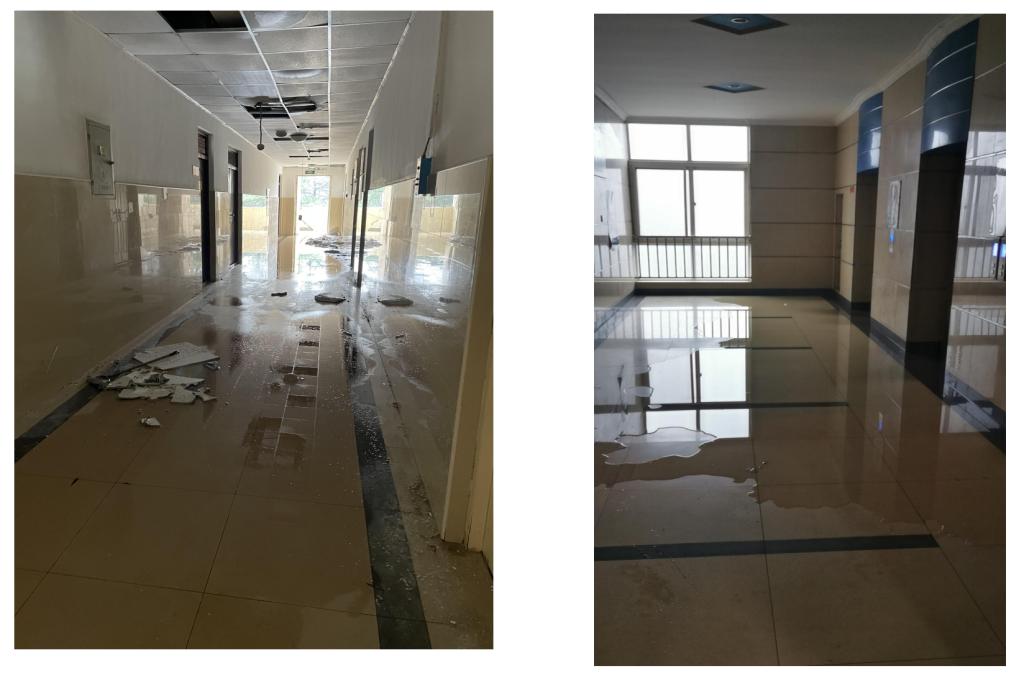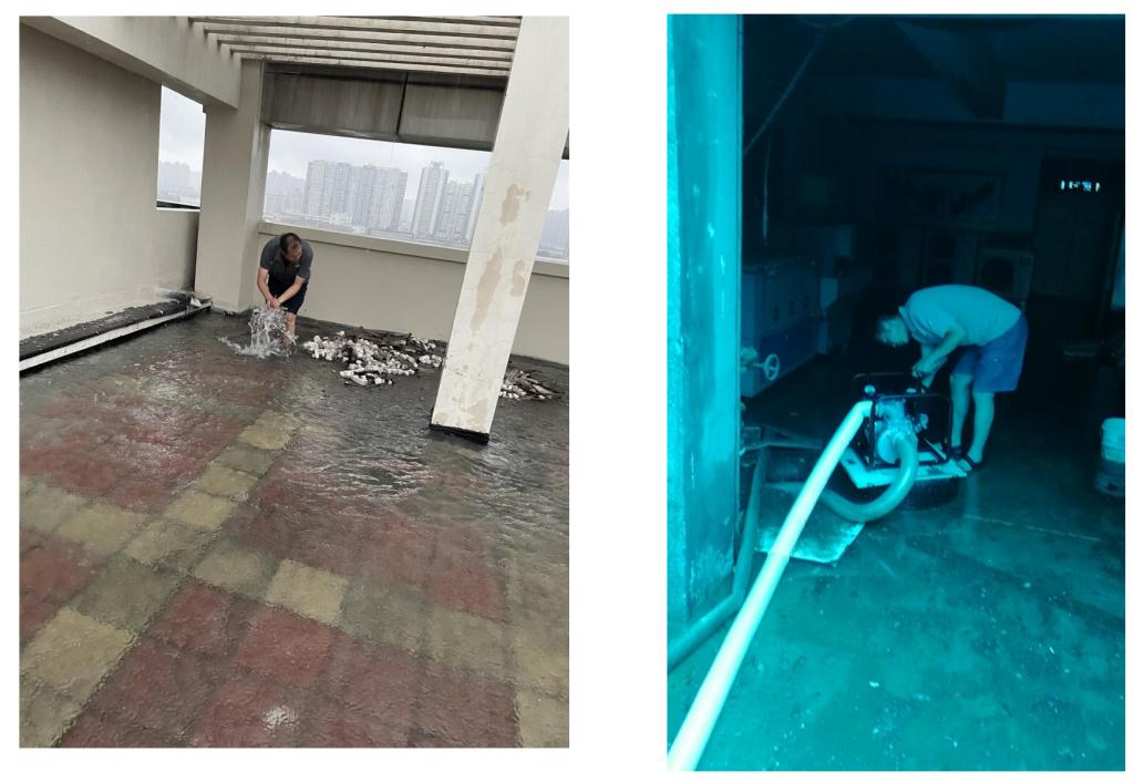 7 月 21 日、22 日两天,管委会组织保卫和后勤人员清理基础实验室、学校餐厅和公寓三号楼的地下室积水,发现校园内面临停水、停电、通讯设备中断的问题,安排保卫处和后勤管理处相关人员及时将受灾情况向主管领导汇报。