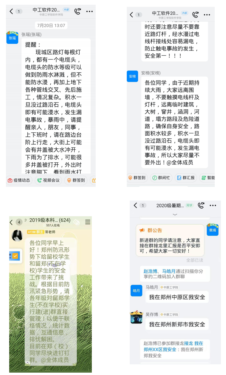 暴雨连降,道路被淹,暂时性断网断水断电,学院暑期留校的12名学生成为学院最为关心的群体。学院党委副书记王雪芳迅速安排所有辅导员对在校人数和在郑人数进行清点,严密关注每名学生的身心健康, 叮嘱学生下雨天非必要不外出,确保人人安全,联络畅通。考虑到留郑学生人数较多,各年级立即建立起留郑留校微信群,通过群接龙等形式在群内报平安,毕业班辅导员还对校外培训学生的安全隐患进行及时关注和安抚,充分做到互通信息,守住学生安全稳定的底线。