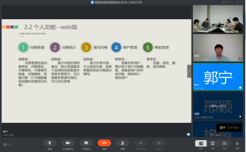 答辩于6月6日上午8点准时开始,分为12组同时进行,每组答辩教师集中在答辩现场,学生以小组为单位进行线上答辩。答辩从小组协同开发、项目分析、技术应用、项目总结以及论文质量等方面对学生进行多方面考察。