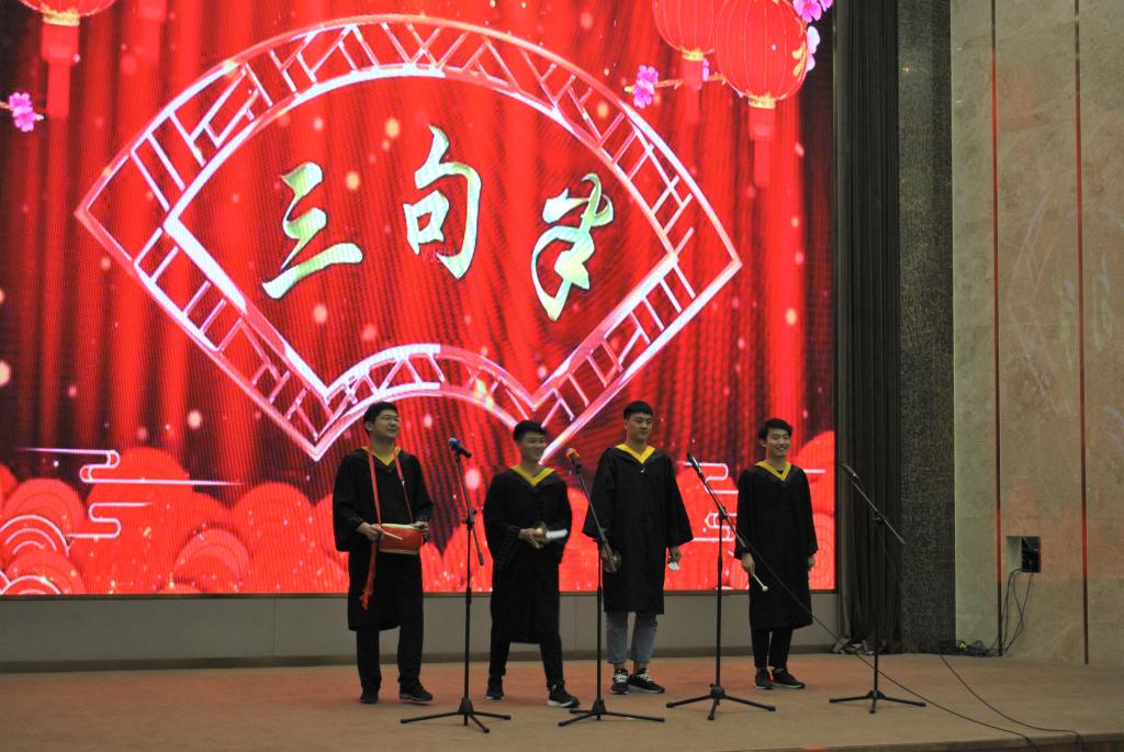 社联街舞社为全体毕业生带来第二个节目《舞中剧》。极具节奏感的音乐伴随着婀娜的身姿、整齐划一的舞步,无疑将整个晚会的气氛带到了高潮。当然,参与演出的不仅是17级18级的学弟学妹们,即将毕业的15级学长张翼翔、褚浩宇、徐消波、陈晨也为大家带来了他们最后的表演《三句半》。他们用幽默的话语吐槽了他们生活了四年的四十四亩地,引得台下师生频频爆笑。刚来中软时的满是频频抱怨,分别之际却又满是不舍,发现中软的生活是那么的幸福快乐。