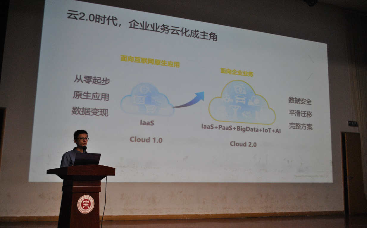 首先,华为云产品总监为同学们介绍了什么是云计算,云计算的基本概念,发展历程,体系结构、模型,优缺点及其实用案例。其中在实用案例中又举出了同学们日常生活中使用频率较高的淘宝,支付宝,共享单车等应用,讲解非常生动形象。