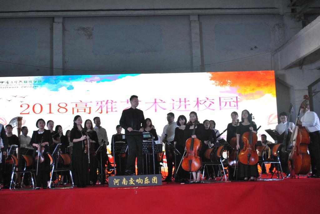 2018年9月19日下午4点30分,“高雅艺术进校园”―――河南省交响乐团专场音乐会在我院室内体育馆隆重举行,给我院广大师生带来了一场中西结合的交响乐艺术盛宴。交响乐团的艺术家们把代表人类优秀文化成果的艺术作品送进校园,让大学生走近高雅艺术,丰富了校园文化生活,提高学生艺术修养,促进大学生全面发展。