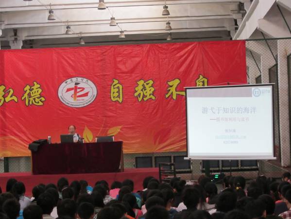 张怀涛教授首先就我校图书馆藏书的种类进行介绍,向新入校的学生讲解了如何寻找索取纸质图书的方法和如何利用我校现有的电子图书资源。接着张教授就读书的策略问题与学生们展开了交流,张教授指出读书要注意博约结合、循序渐进,注意要巧用时间,融会贯通。最后,张教授着重强调读书要讲究方法,针对不同的书籍,选用不同的阅读方法,灵活运用广读法、深度法、速读法以及联读法等不同方法。