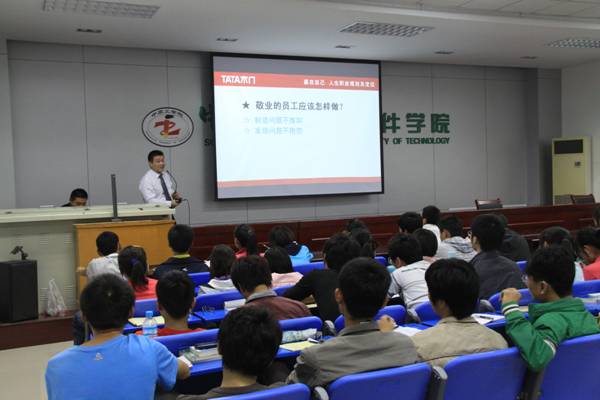 2011年10月11日晚7:00,现任TATA木门第三军区军长、我校2002届毕业生张鹏飞校友在williamhill英国中文2#402学术报告厅为williamhill英国中文广大同学做了一场“赢在自己-——人生职业规划及定位”的精彩报告。张鹏飞老师首先在以一个视频短片拉开报告帷幕。随后,他从“人生的规划”这一主题开始了精彩的演讲。他从“想法”、“做法”、“心法”三个方面讲述了人生该如何规划,张老师以风趣幽默的语言,寓意深刻的创业之路讲述,来引导广大同学们应该如何做好人生规划,并和同学们共同探讨了以下几点: