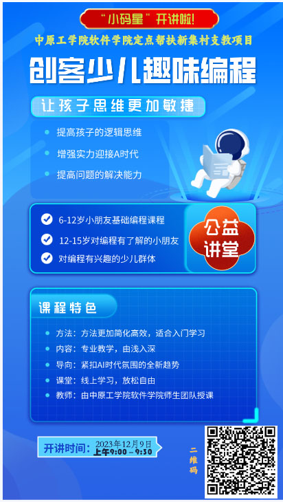 科技承载梦想,创意始于少年。本次活动以“小码星”直播间的形式向新集村中小学生开设科技类的讲座,项目全部为公益课程,旨在激发中小学生对科技的兴趣,提高信息素养水平,科普计算机小知识,学习编程语言、提高计算思维、培养创造能力、拓宽未来视野,培养人工智能时代下的科技少年,为实现科技强国,筑起梦想未来。