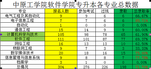我院2020年共有专科毕业生315人,276人报名参加了“普通专升本”考试,198人被本科院校录取,录取率为71.7%,占2020年毕业生人数的62.9%。其中河南科技大学、郑州轻工业大学、河南工程学院等16所院校共录取81人,占录取人数的40.9%。