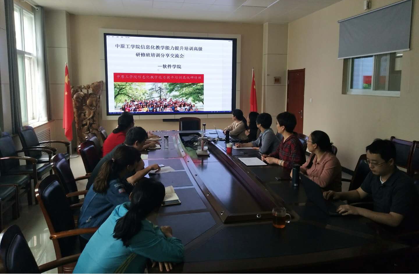 为了分享此次培训学习成果,我院今天中午召开了针对此次培训的分享交流会,重点分享此次学习的信息化学习方式、TPACK及APT教学模式、混合式教学、翻转课堂、智慧课堂等。通过此次分享活动,促进各位教师的交流沟通,共同探讨如何提升信息化教学能力、如何提高学生的学习兴趣、提高课堂教学效果以及学生的学习效果。