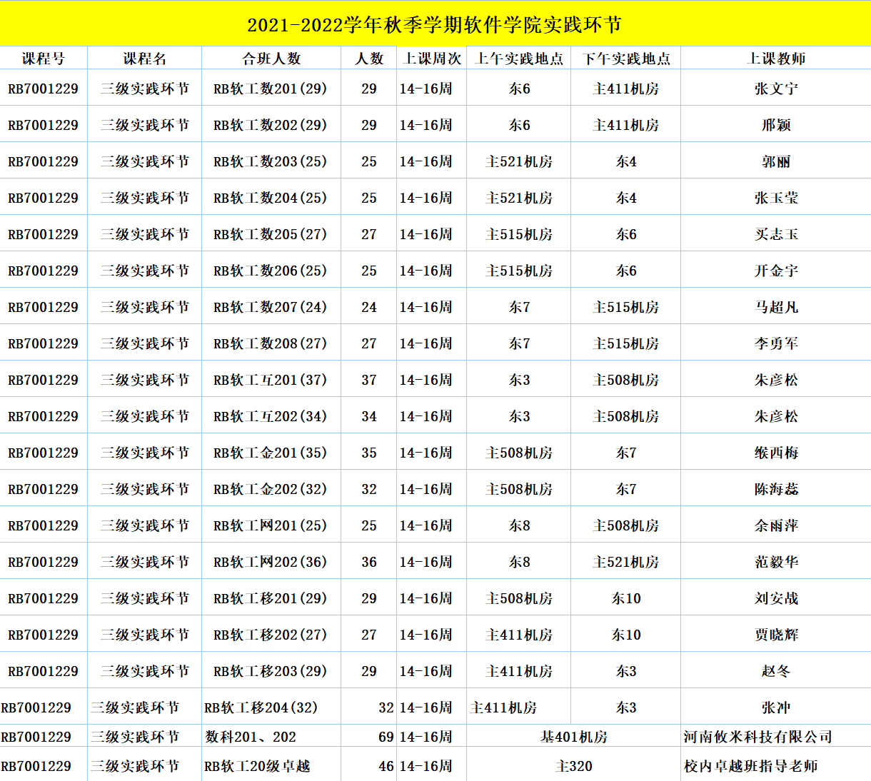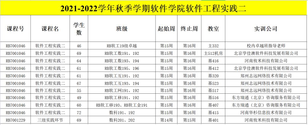 当前位置: 首页 >> 实践教学 >> 集中实践 >> 正文 2021-2022学年秋季学期实践课题安排 发布日期:2021-12-01 作者: 点击: 2021-2022学年秋季学期实践课题安排,如下图所示: 2019级软工实践二安排: 2020级三级实践环节安排: 上一条:2024-2025学年秋季学期软工实训安排 下一条:2020-2021学年春季学期实践课题安排
