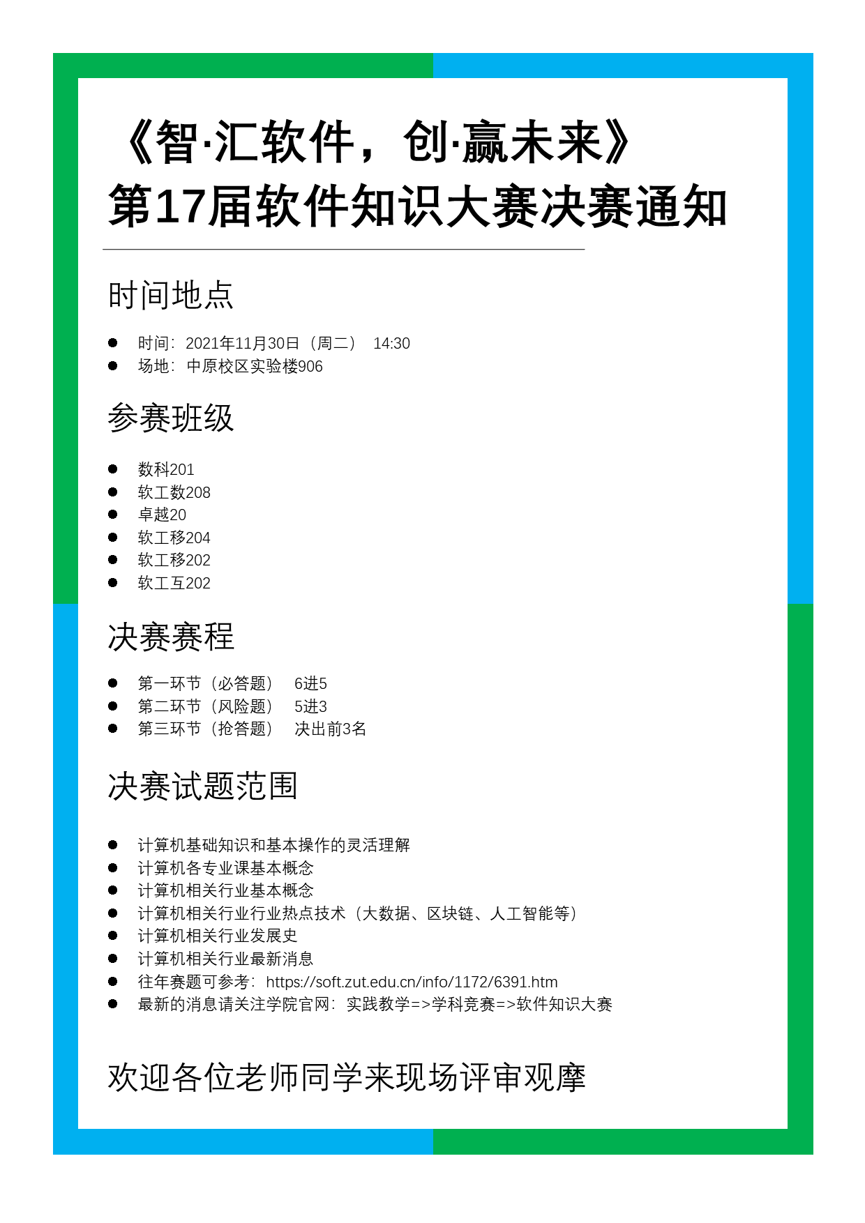 当前位置: 首页 >> 实践教学 >> 学科竞赛 >> 软件知识大赛 >> 正文 第17届软件知识大赛决赛通知 发布日期:2021-11-28 作者: 点击: 上一条:第十八届软件知识大赛初赛结果 下一条:2021第十七届软件知识大赛初赛成绩