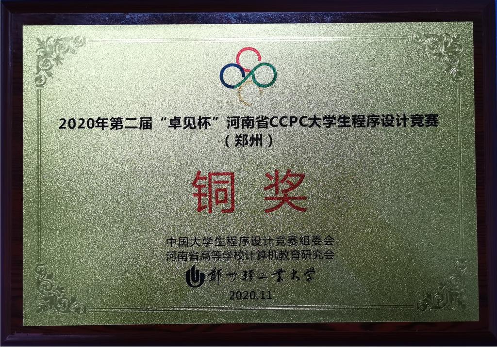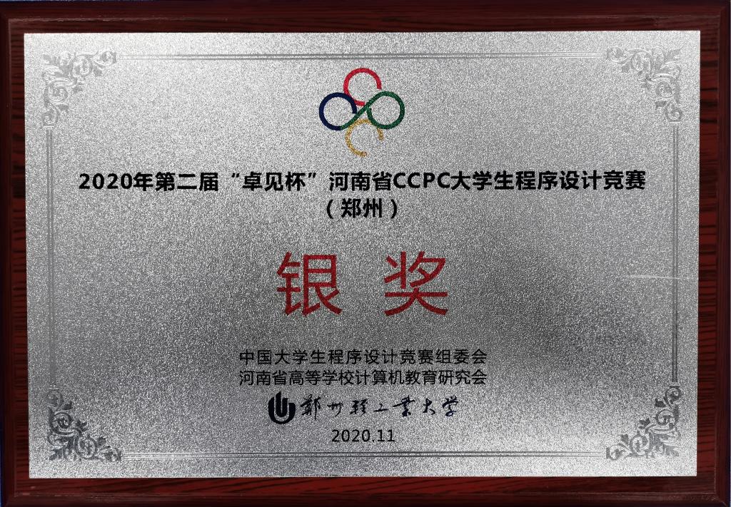 由我院软工数195班程子函、卓越191班侯迎圣、软工互193班王金昌组成的团队和由卓越191班邱天乐、侯昊然、李帅聪组成的团队分别获得了本次河南省CCPC省赛的银奖,由卓越181班方禹童、汪先锋、吕博杰组成的团队和由卓越181班李鹏飞、王荣昌、柏路路组成的团队分别获得了本次河南省CCPC省赛的铜奖,由软工数191班翟锦坤、张朝栋、软工数192班方永豪组成的团队获得了本次河南省CCPC省赛的优胜奖。