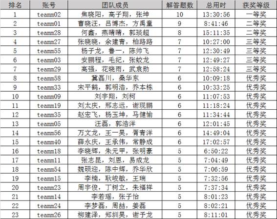 经过四个小时的激烈比赛,最终卓越161的焦晓阳、卓越161的张坤、RB软工移184的高子翔同学组成的团队荣获大赛一等奖; RB软工金181的曹晓旺、卓越181的吕博杰、卓越181的方禹童同学组成的团队荣获大赛二等奖,卓越181的何鑫、RB软工互182燕晴晴、卓越181郭琰超同学组成的团队荣获大赛二等奖;卓越181的张晓晓、卓越181的柏路路、卓越181的余建青同学组成的团队荣获大赛三等奖,卓越181的高强、卓越181的花晓雨、卓越181的武袁勋同学组成的团队荣获大赛三等奖,软工移184的安鹏程、软工移184的毛纪、软工移184的张蛟龙同学组成的团队荣获大赛三等奖,RB软工网181杨子龙 、RB软工网181鲁一、RB软工网181陈帅飞同学组成的团队荣获大赛三等奖。