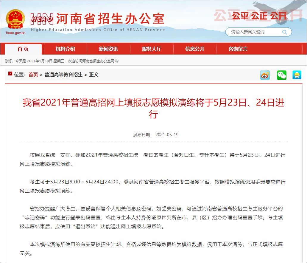考生可于5月23日9:00~5月24日24:00,登录河南省普通高校招生考生服务平台,按照模拟演练使用手册要求进行网上填报志愿模拟演练。