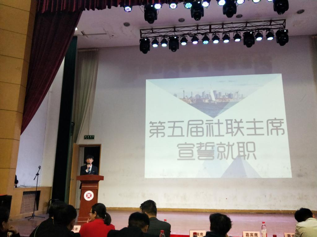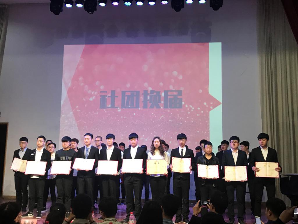 首先进行的是社团社长换届,由社联指导老师刘欢老师为老社长颁发荣誉证书与纪念品,并授予新任社长聘书。篮球社新任社长李通代表全体社团成员发表了精彩的就职演讲。