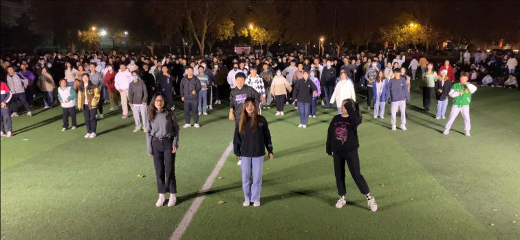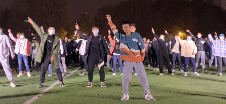 集体广场舞的第一首曲目是《酒醉的蝴蝶》,同学们随心而动,随乐而舞。他们放松身心,拂去学习的疲惫。第二首曲目《冬天里的一把火》火热激情,同学们跳出了“恰同学少年,风华正茂”的自信昂扬。第三首曲目《最炫小苹果》轻松欢快,同学们的喜悦溢于言表,笑容满面,一扫疫情下的阴霾。第四首曲目《失恋阵线联盟》诙谐幽默,同学们在欢声笑语中体会舞蹈的快乐。