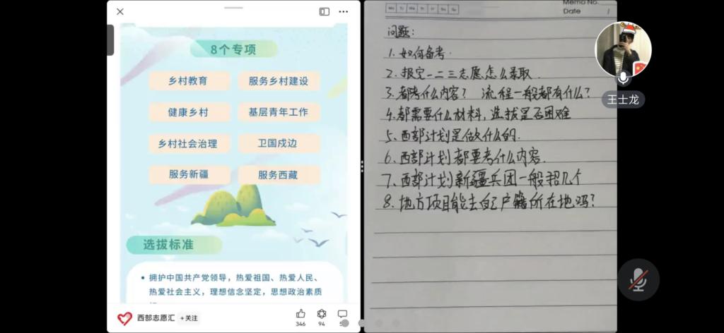 分享会上,杨爽、王士龙、李文博分别说明了“西部计划”的背景、政策要求、工作内容和报考流程,通过图文详细介绍了在基层开展志愿服务工作的情况,讲解了准备过程的注意事项,强调了最重要的是要保持良好的心态。三位分享人还就前期收集到同学们感兴趣的问题进行了逐一耐心解答,在场辅导员也就学生所关心的问题与他们进行了互动交流。