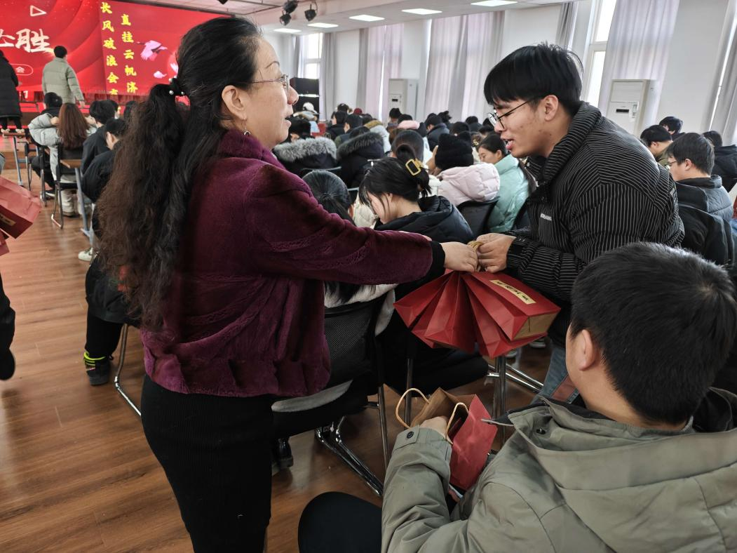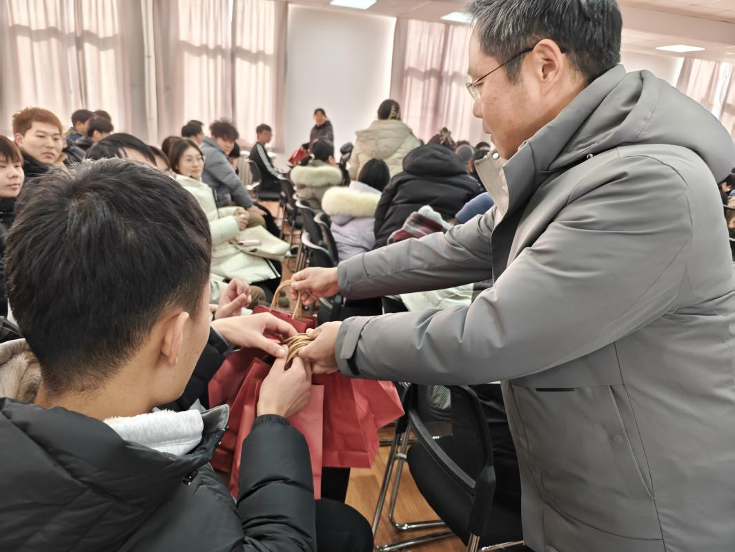 伴随着隆重的校歌,与会领导、老师纷纷走到同学们中间,将精心准备的上岸礼包发放到每名考研学子的手中。今年,学院特意为每名同学准备了考研成功袜、金榜题名书签和逢考必过口罩,不仅让同学们从头到脚喜庆如意,而且为他们防寒保暖。承载着满满寓意和祝福的温暖礼包,让同学们惊喜感动,仪式感满满。