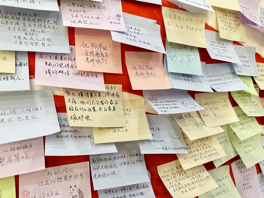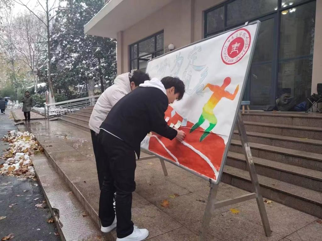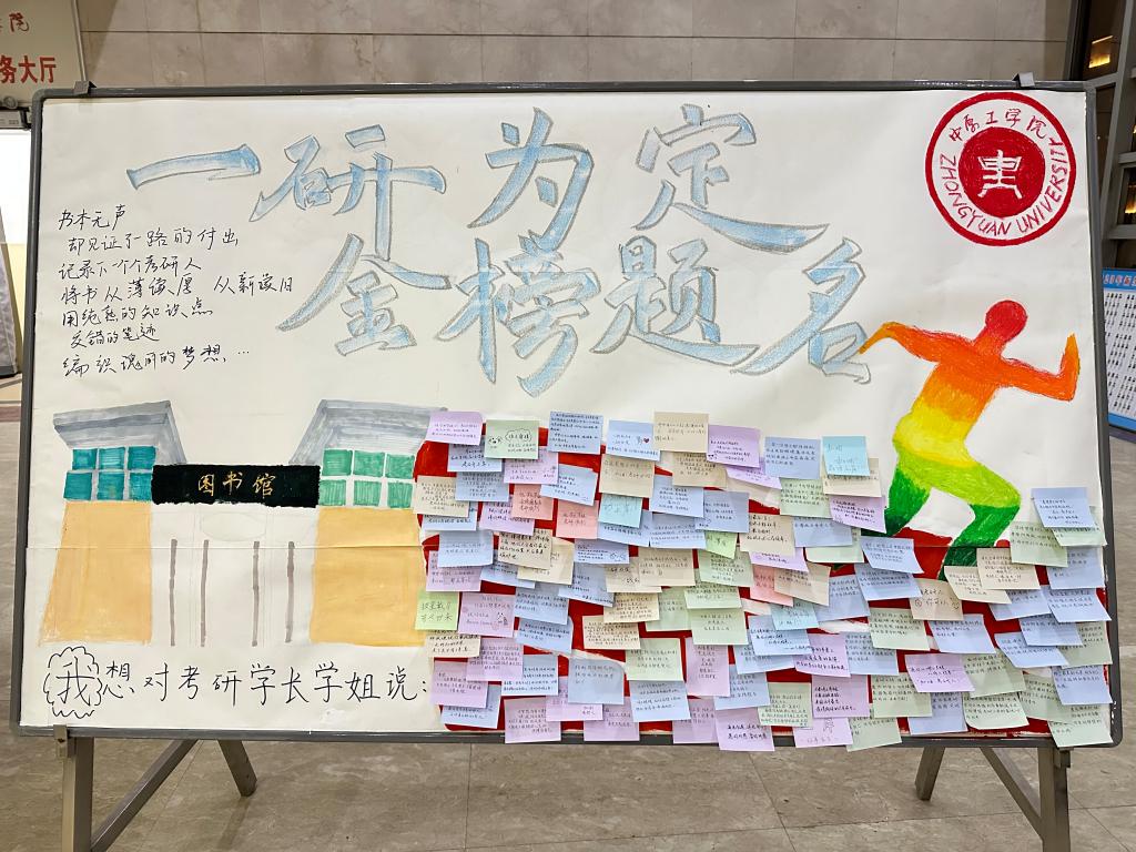 12月18日晚,活动志愿者们相聚在一起用暖心的文字和灵动的图画,一笔一画描绘自己对学长学姐们真切的祝福和期望。他们在展板上绘制了学校图书馆的大楼、一位运动员在赛场上奔跑,还有“一研为定 金榜题名”八个大字。大家一起在展板上写下对考研学长学姐们的赠言与祝福,一百余张五颜六色的便利贴承载着大家的共同祝福汇聚成一股暖流流向每名考研学子的心间。