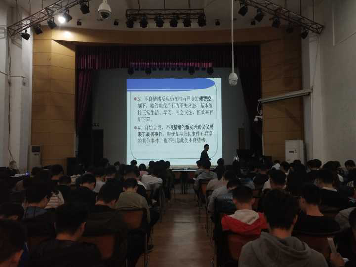 紧接着,杨老师以心理健康的分类对心理问题人群进行了分类,并讲述了造成心理不健康人群产生心理问题的原因。在讲述心理问题时,杨老师用形象的语言,为学生们讲解各种心理问题的危害,并举出近来发生的各种案例,让同学们真切地感受到了心理问题的严重性。