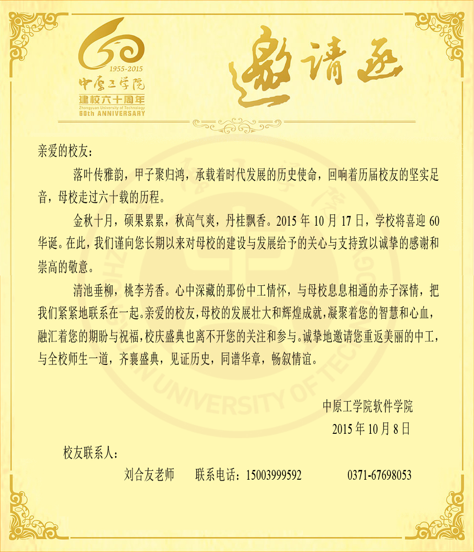当前位置: 首页 >> 学院公告 >> 正文 建校六十周年邀请函 发布日期:2015-10-09 作者:学工办 点击: 上一条:关于WilliamHILL中国Android移动应用上线的通知 下一条:软件工程师讲座(之第六十三讲)通知