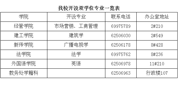 鉴于此,请有意愿攻读双学位的同学,为保护自身合法权益,仔细甄别,切勿轻信校外社会培训机构宣传。如需要咨询双学位相关事宜,可直接联系教务处学籍科或我校双学位专业学院教学办公室,联系方式如下。