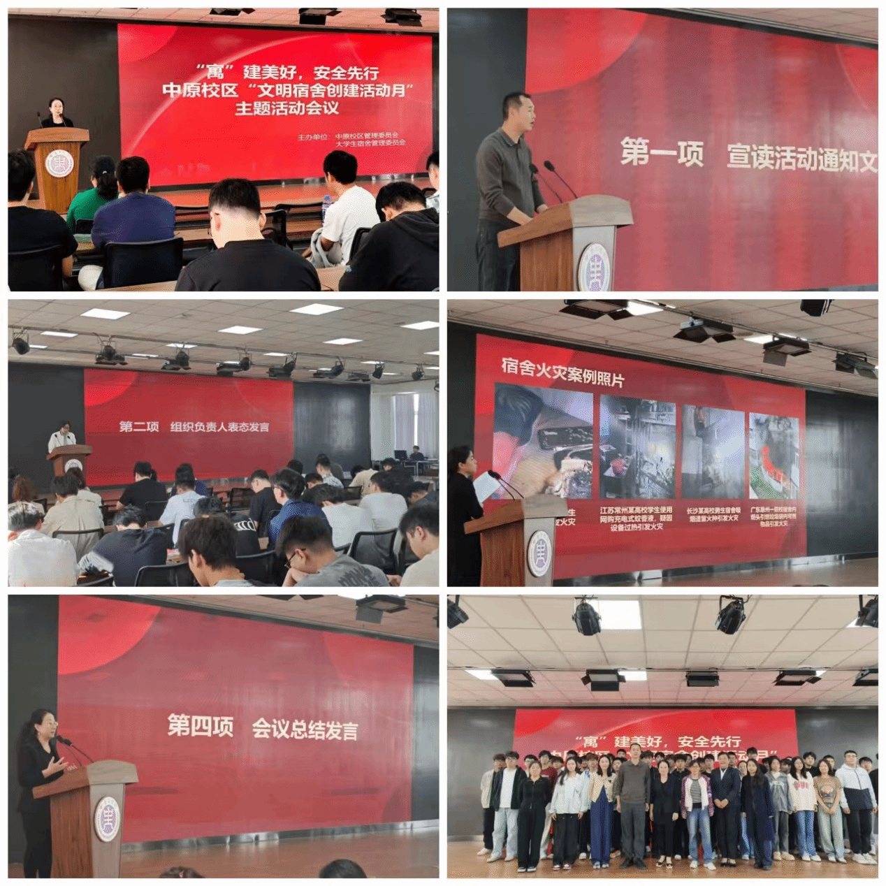 会上展示了中原校区近期宿舍检查评比结果对优秀宿舍进行了分享展示,同时观看了高校学生宿舍发生的火灾典型案例。